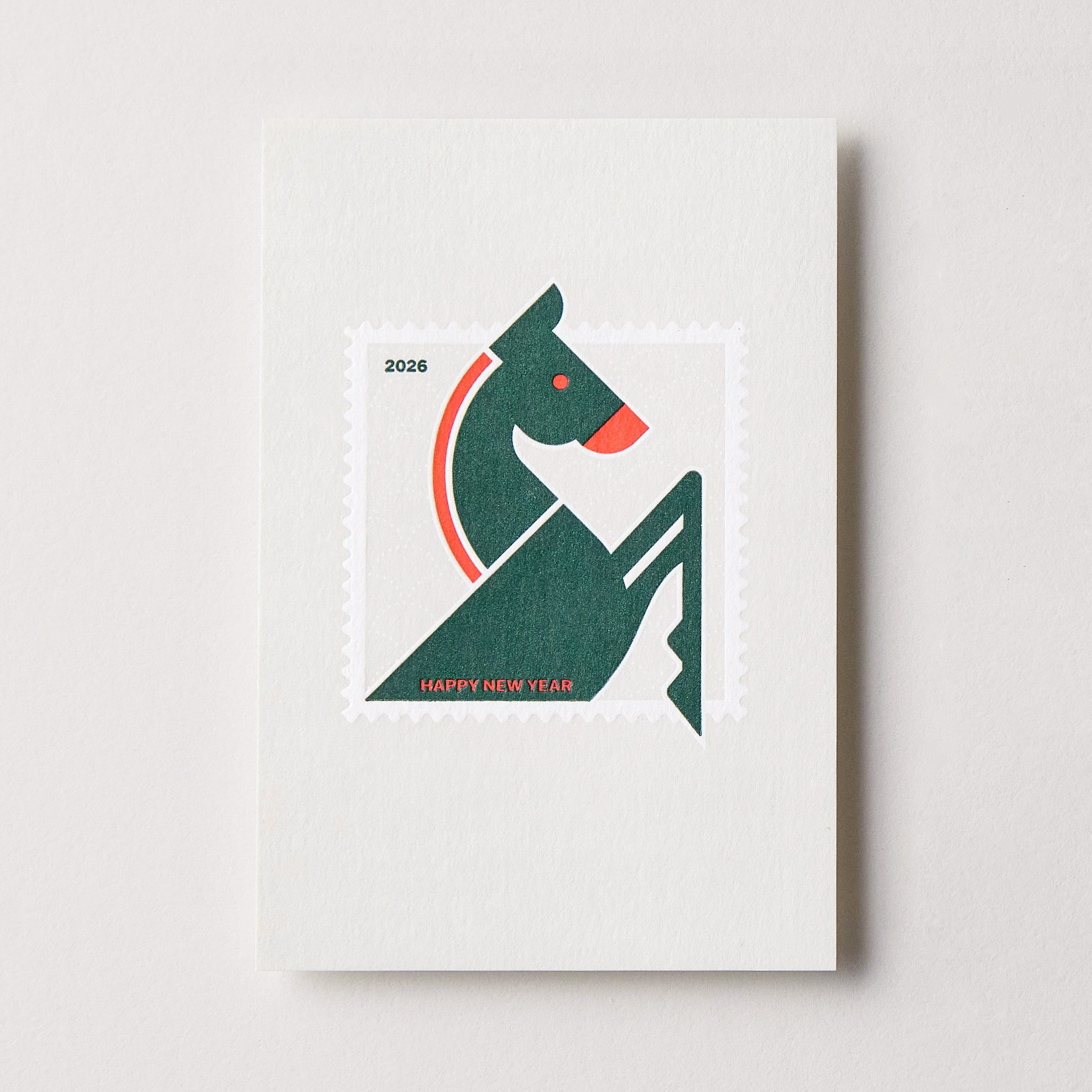 北欧デザインのようなシンプルで温かみのある、切手モチーフの年賀状。