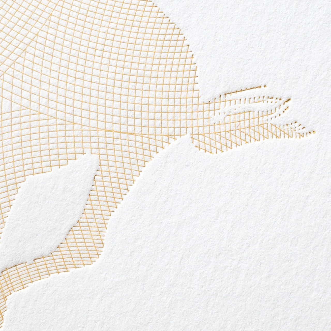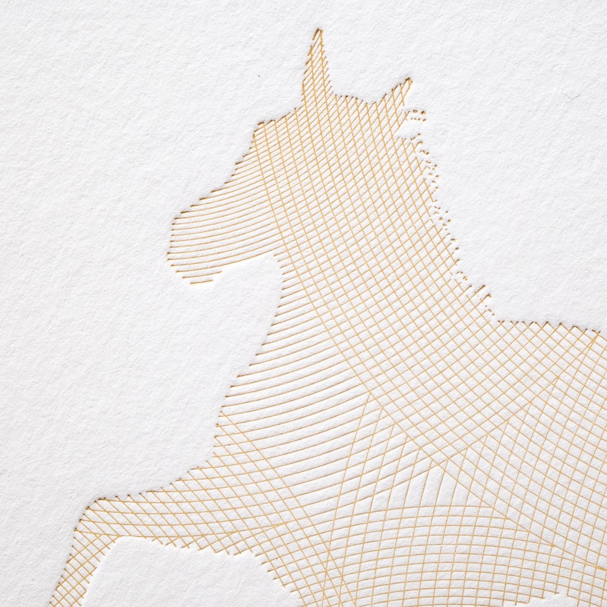 繊細に交わるシンプルなラインのみで印刷された馬。細やかな線で印刷された模様は、活版印刷の特徴である凹凸を活かしてその躍動感を表現しています。